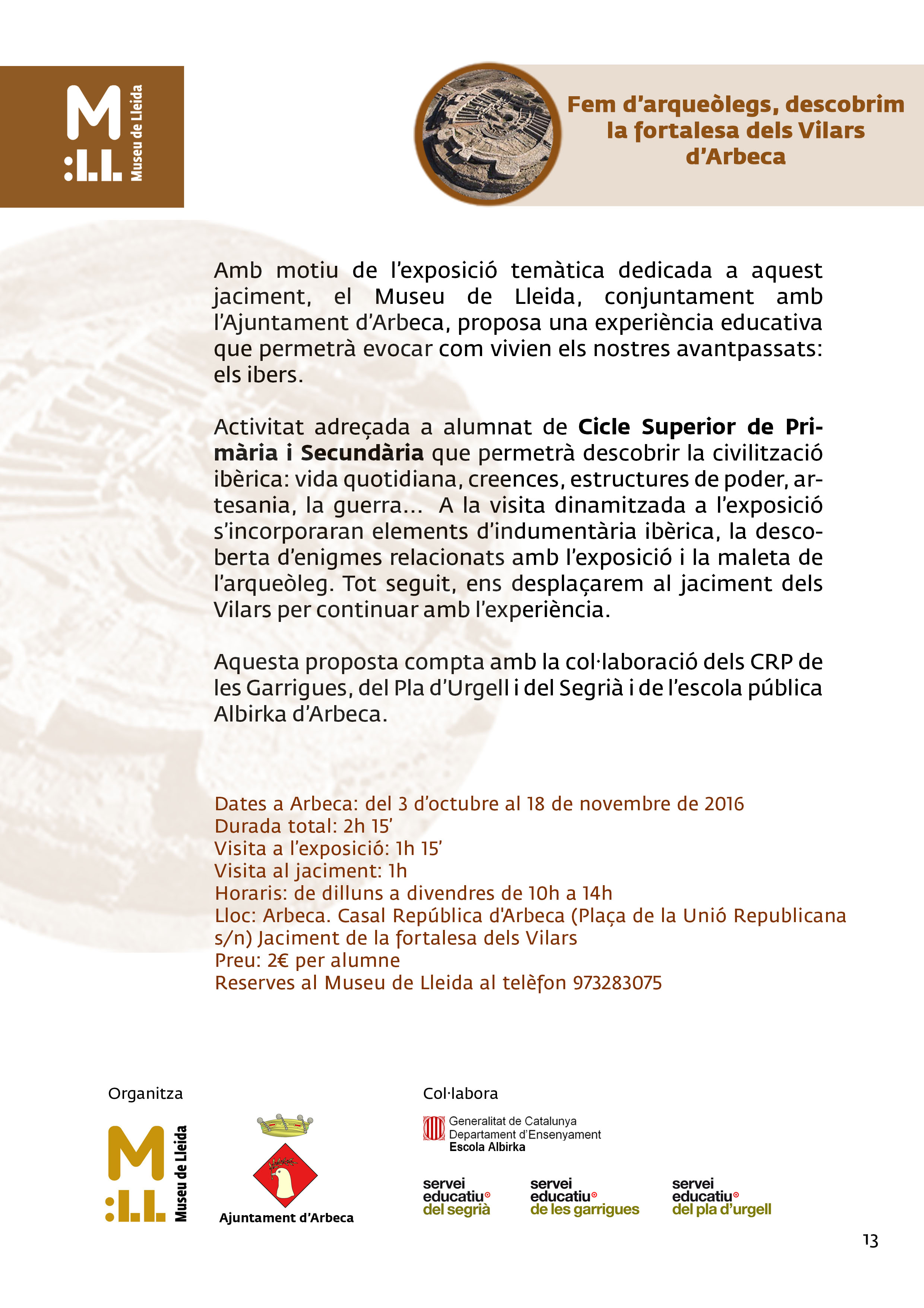29 juny 2016 El curs vinent “Fem d’arqueòlegs” a la Fortalesa dels Vilars per Servei Educatiu | publicat a: General | 0 Feu una ullada al vídeo de l’exposició
