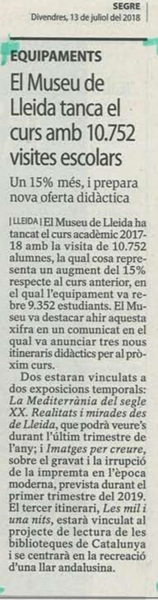 Més de 10.700 alumnes han visitat el museu durant el curs escolar 2017-2018. Un total de 10.752 alumnes han visitat el Museu de Lleida durant el curs 2017-2018, el que representa un increment del 15% respecte al curs escolar anterior, en que el van visitar 9.352.