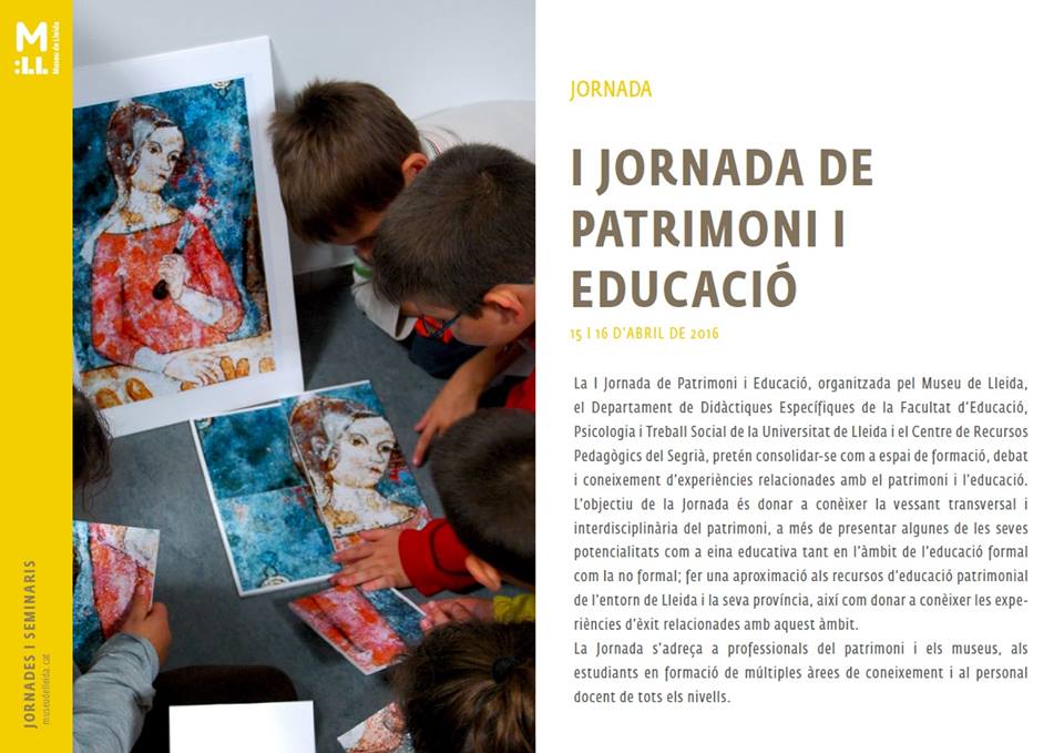 Els propers dies 15 i 16 d’abril tindrà lloc la I Jornada de Patrimoni i Educació, organitzada pel Museu de Lleida, el Departament de Didàctiques Específiques de la Facultat d’Educació, Psicologia i Treball Social de la Universitat de Lleida i el Centre de Recursos Pedagògics del Segrià. La jornada pretén consolidar-se com a espai de formació, debat i coneixement d’experiències relacionades amb el patrimoni i l’educació.